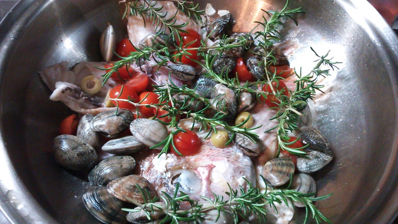 新鮮な魚介類とミニトマト、ドライトマト、オリーブ、ローズマリーなど材料を入れてオリーブオイルで炒めるだけ(笑)