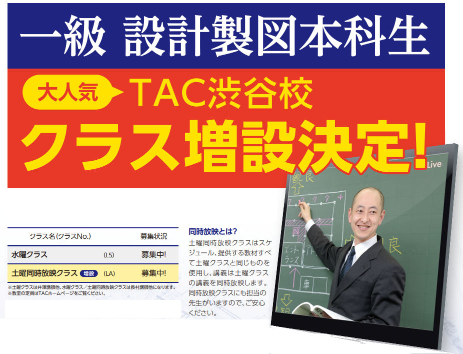 また上記の一級設計製図本科生の土曜クラスに、同時放映クラスを設けます!
