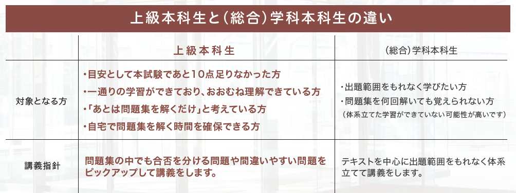 上級本科生は過去本試験問題を分析し間違えやすい項目や、絶対押さえるべき重要項目をピックアップして講義します。4月の開講まで現状のレベルを維持するために自分で問題集を解いておく必要があります。自分で進めるのが難しい方は学科本科生を選択することをオススメします。