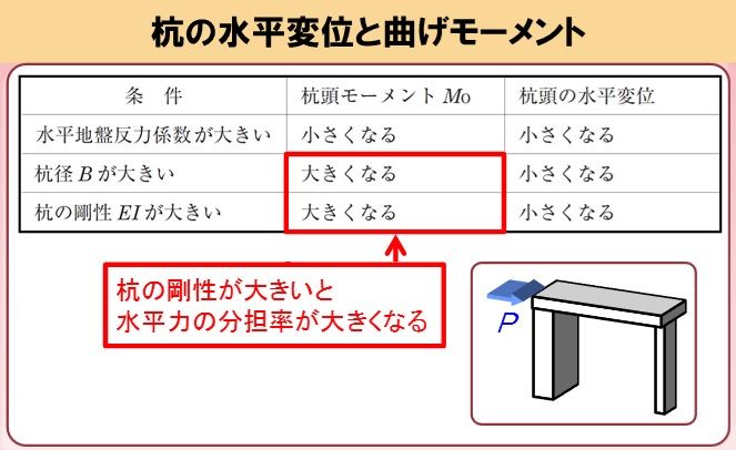 杭径が大きいと(=杭の剛性が大きいと)、硬くなり、変形が小さくなるので杭頭モーメントは小さくなる、と考えると間違えます。